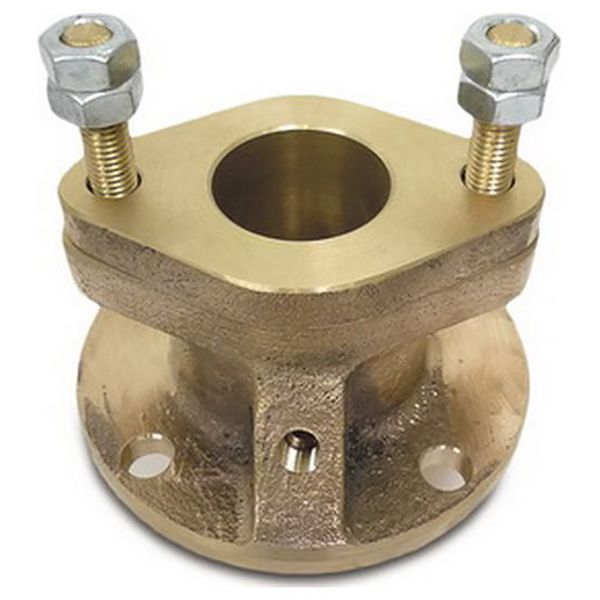 This stuffing box is designed to fit a 1-1/2" shaft and is accompanied by 2 M10 brass studs and 4 galvanized M10 nuts for secure fastening.