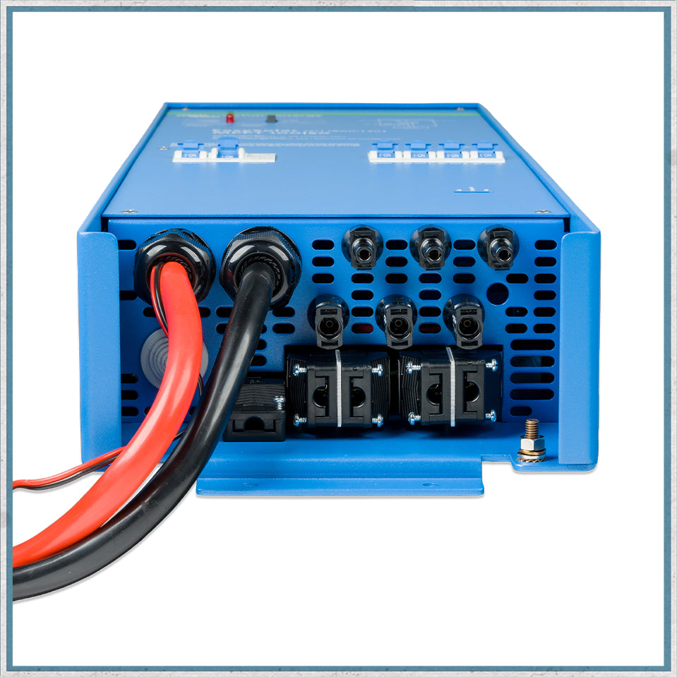 This Easy Solar comes in either a 12v or 24v version, with a built-in MPPT charge controller and the MultiPlus Compact inverter/charger sharing the DC battery cables (included). The batteries can be charged with solar power (SmartSolar MPPT) and/or with AC power (inverter/charger) from the utility grid or a genset.