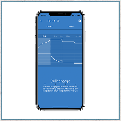 The charger enables remote monitoring and configuration via its built-in Bluetooth connectivity. Easily monitor status and configure all settings from your Android or Apple device using the VictronConnect app. With IP67 protection, this charger is designed to last.